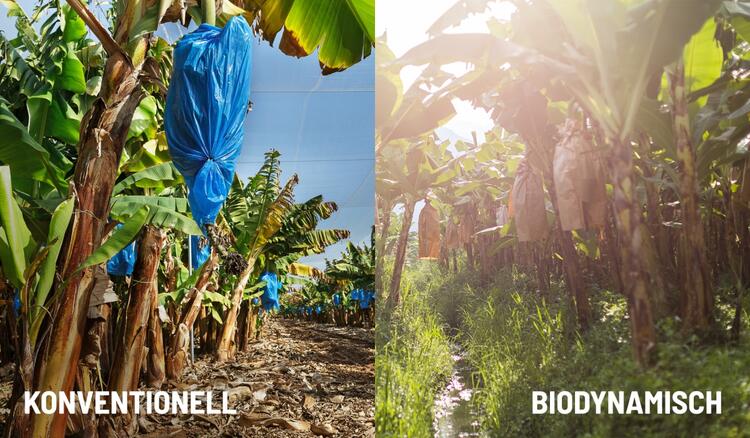 Die Förderung der Biodiversität im und über dem Boden ist für biodynamische Landwirt:innen von entscheidender Bedeutung. Auf den Bananenfarmen findet sich ein ganzes Universum an Pflanzen, Mikroorganismen, Insekten, Vögeln und anderen Lebewesen. Das sieht man auch auf den Bildern im Vergleich zur konventionellen Landwirtschaft, wo nur die Bananenpflanzen wachsen. Alles andere wurde durch Herbizide entfernt.