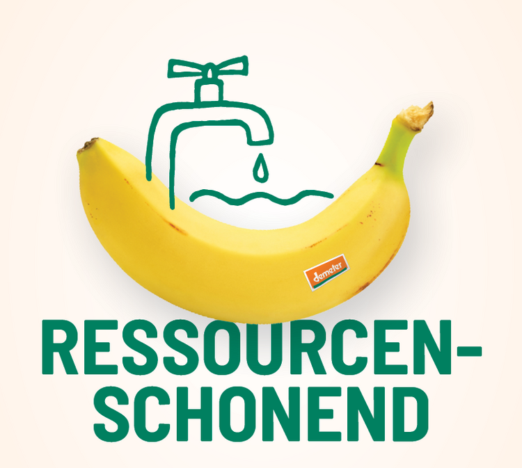Demeter-Bananen schonen Ressourcen! Weil die Böden, auf denen sie wachsen, mit Kompost, Mist, Gründüngung und Mischkultur stark und lebendig erhalten werden, bilden sie mehr Humus, und der ist ein hervorragender Wasserspeicher. So werden knappe Wasserressourcen besser genutzt. Demeter-Betriebe, die in Regionen mit Wasserproblemen liegen, müssen zudem in einem Wasser-Management-Plan erklären, mit Hilfe welcher Maßnahmen sie ihren Wasserverbrauch reduzieren und lokale Gewässer schützen wollen. So sorgen Demeter-Landwirt*innen mit großem Engagement für eine Natur, die gesund und fruchtbar bleibt.