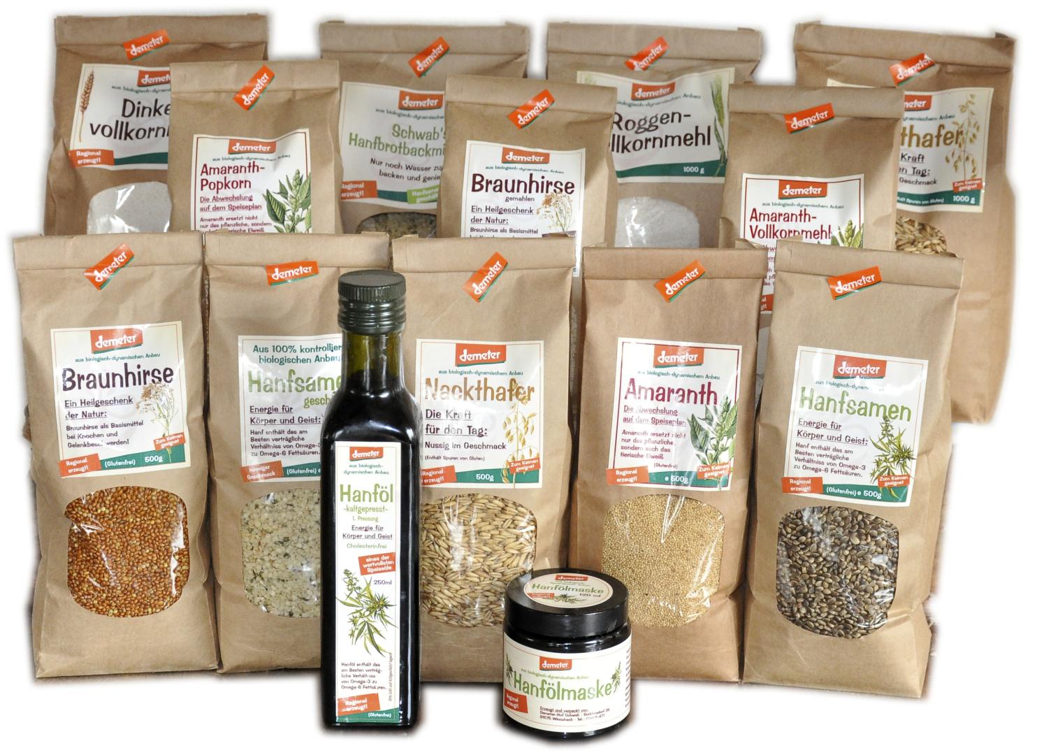 spezialisiert. Dazu gehören Hanf,- Braun,-Goldhirse, Buchweizen Amarant,- Lein,- Dinkel,- Roggen, Weizen, Nacktgerste, Nackthaferprodukte.