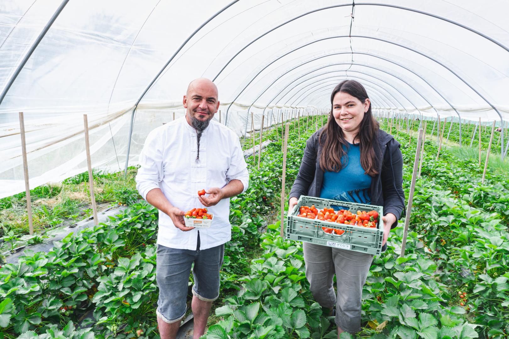 bauen in unsere Folienhäusern und im freien Obst und Gemüse in Demeter Qualität an .