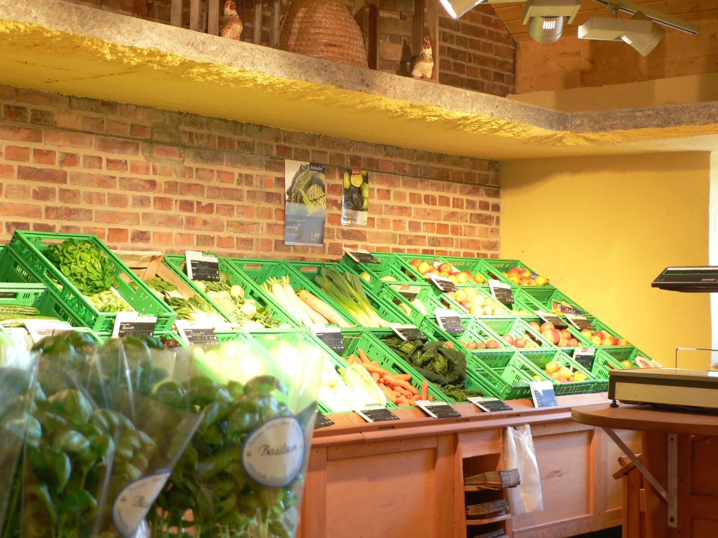 Im großen Hofladen werden Gemüse vom Hof sowie Fleisch- und Wurstwaren überwiegend