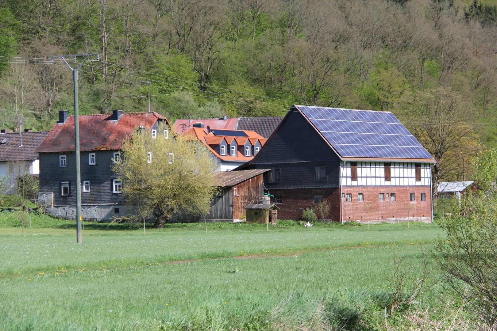 Die Photovoltaikanlage auf dem Stalldach nutzen wir zur Stromgewinnung. Warmes Wasser erhalten wir durch die Solaranlage auf dem neuen Haus bzw. durch die Heizung mit Brennholz aus dem eigenen Wald.