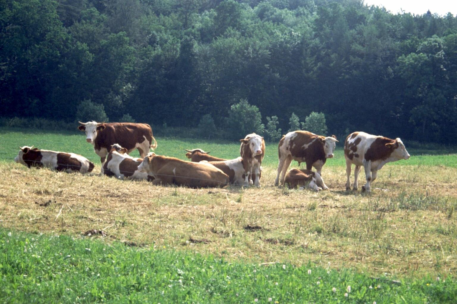 Das Herzstück des Hofes ist unsere Milchvieherde. Die 24-köpfige Herde geniesst den ganztägigen Bewegungsfreiraum, den Auslauf und die unbegrenzte Fress- und Liegemöglichkeit. Im Sommerhalbjahr kommen die Tiere auf die Weide, gemolken werden sie in einem Melkstand. Es gibt praktisch keinen Tierzukauf von außen, die Herde erneuert sich nur über die eigene Nachzucht. Die geringen Tierwechsel und der häufige Menschenkontakt machen die Herde sehr ruhig und zutraulich. Ein Großteil der Kälber werden auf dem Betrieb großgezogen um einmal Milchkuh oder Schlachtvieh zu werden.