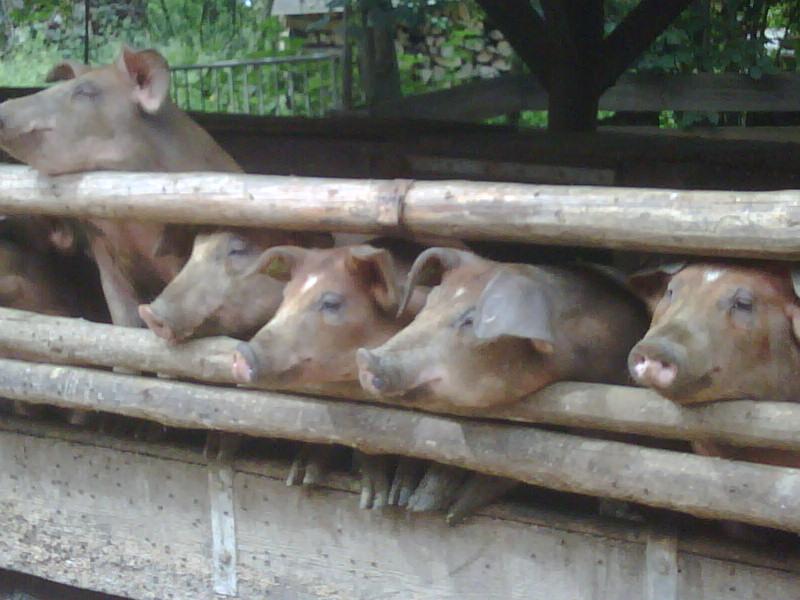 Die Schweinehaltung besteht aus ca. 20 Tieren. Die Schweine sind die Resteverarbeiter des Betriebs. Molke aus der Käserei, Gemüseabfälle und Ausputzkartoffeln werden hier verwertet.