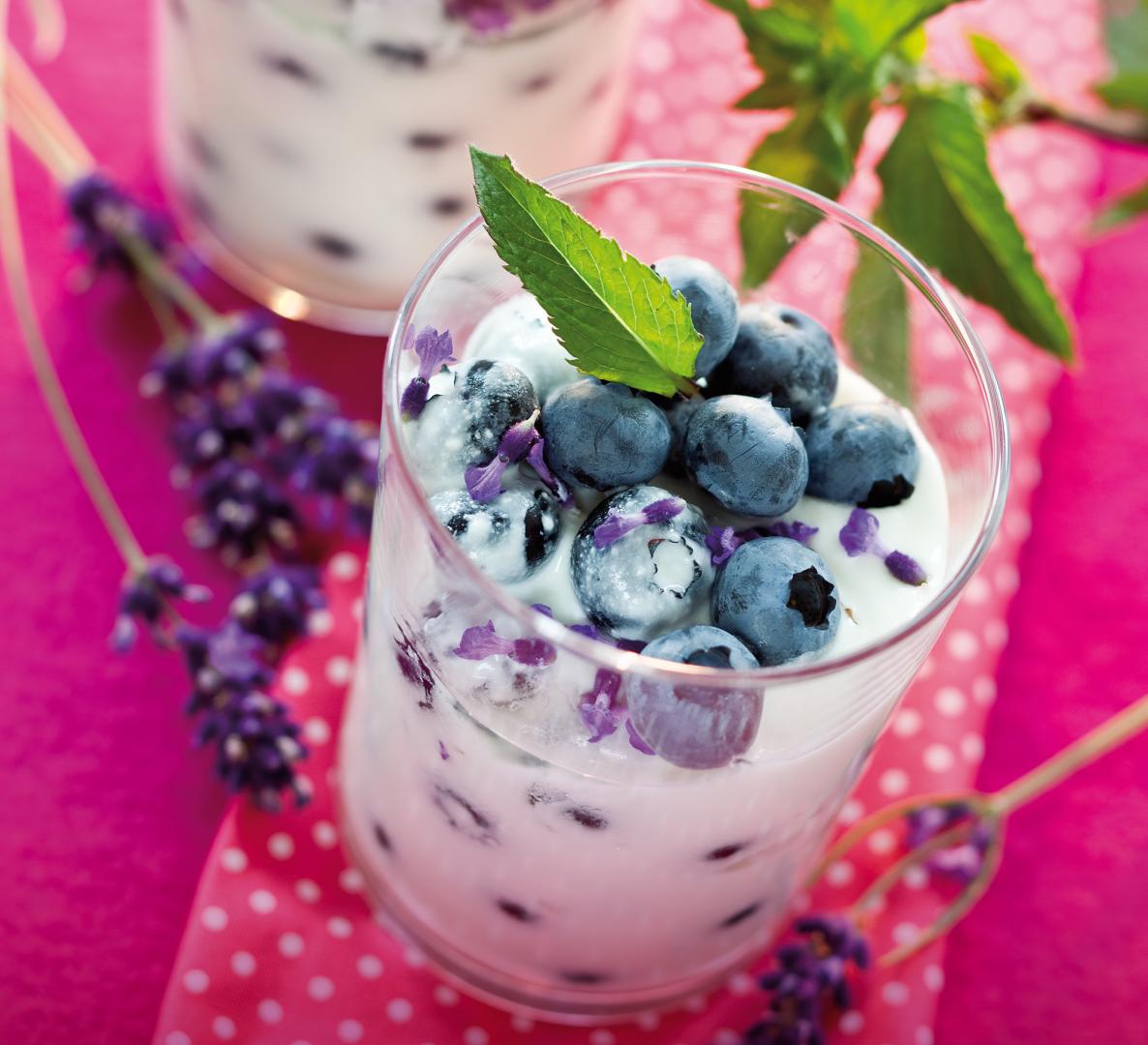 Heidelbeeren mit Joghurt verrühren, klein geschnittenen Lavendel, Minze und Stevia dazurühren, durchziehen lassen und kalt servieren.