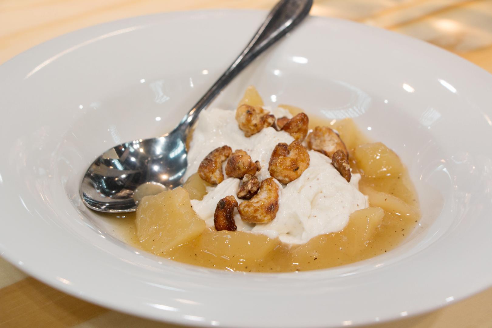 Für das Ragout die Birnen falls notwendig schälen, je nach Sorte kann man die Schale aber auch gerne dranlassen. Die Birne vom Kerngehäuse befreien und dann entweder in schmale Spalten oder Würfel schneiden. In einem geräumigen Topf mit 2 EL Zucker und etwas Honig einen hellen Karamell herstellen, diesen mit Apfelsaft und einem Schuss Weißwein ablöschen. Eine Nelke, ein Sternanis, eine Stange Zimt in den Sud geben und die geschnitten Birne im Sud so lange köcheln, bis sie gerade so weich ist. Mit etwas Speisestärke den Sud leicht anbinden und etwas Zitronenabrieb dazugeben. Dies kann dann gut eine Nacht durchziehen. Für die karamellisierten Nüsse in einer Pfanne den Boden mit Zucker dünn bedeckt einen hellen Karamell herstellen und dann die Nussstücke hinzufügen. Unter ständigem Rühren den Karamell nun fertigstellen, er sollte die Nüsse schön gleichmäßig einschließen. Aus der Pfanne auf ein Pergament geben und auskühlen lassen. Topfen und Vanillemark oder gemahlen Schote mit dem Handrührgerät gut aufschlagen, nach Belieben leicht süßen. Das Birnenragout in Schälchen anrichten, den Topfen sowie die Nusskaramellstückchen obenauf geben.