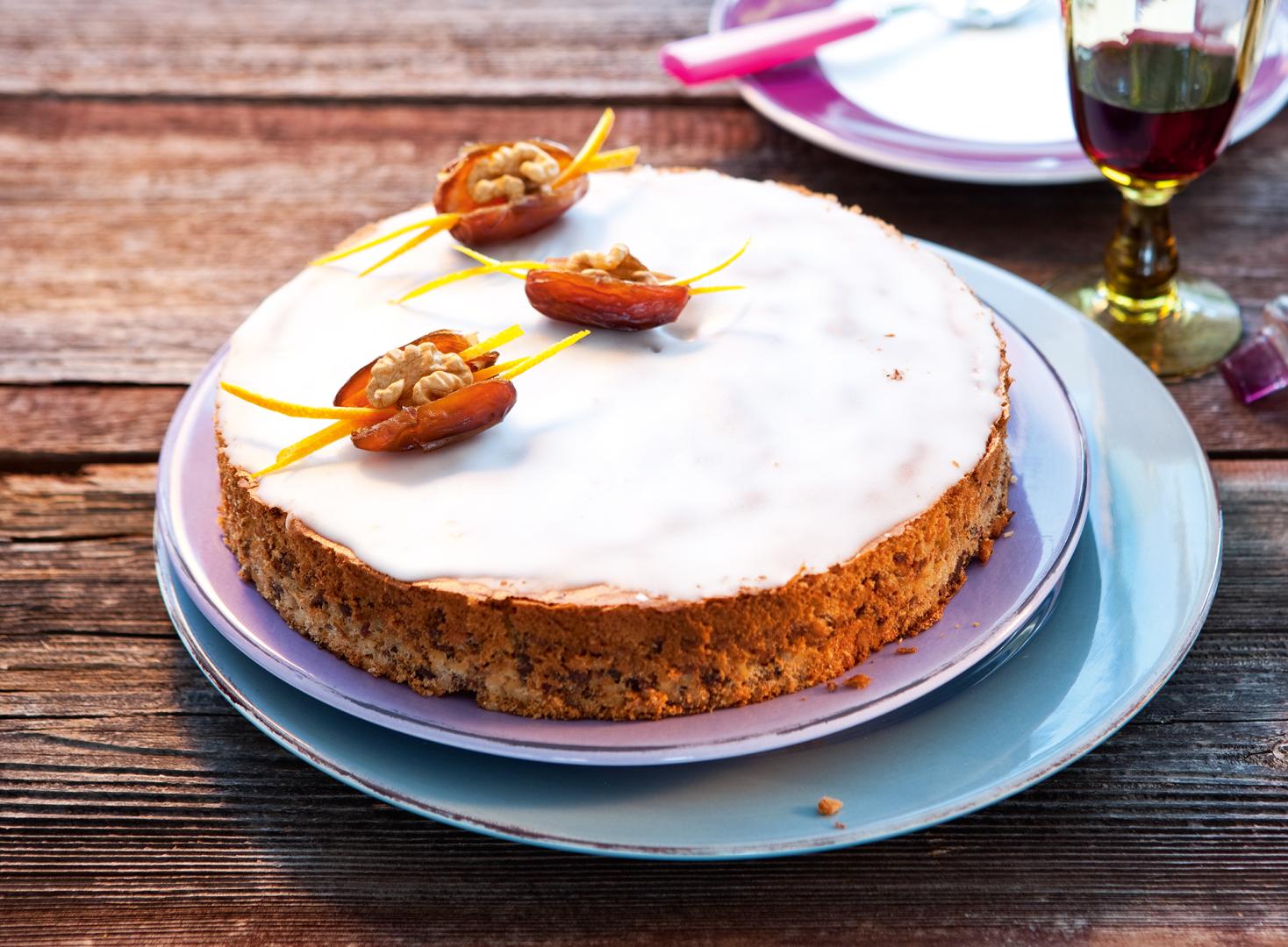 Eier trennen, Eiweiß fest schlagen. Die übrigen Zutaten zu einem Rührteig verarbeiten, Eischnee vorsichtig unterheben. In gefettete Springform füllen, bei 220° C 20 Minuten backen, dann bei 200° C weitere 15 Minuten backen. Mit Zuckerguss bestreichen und mit Dattelhälften verzieren.