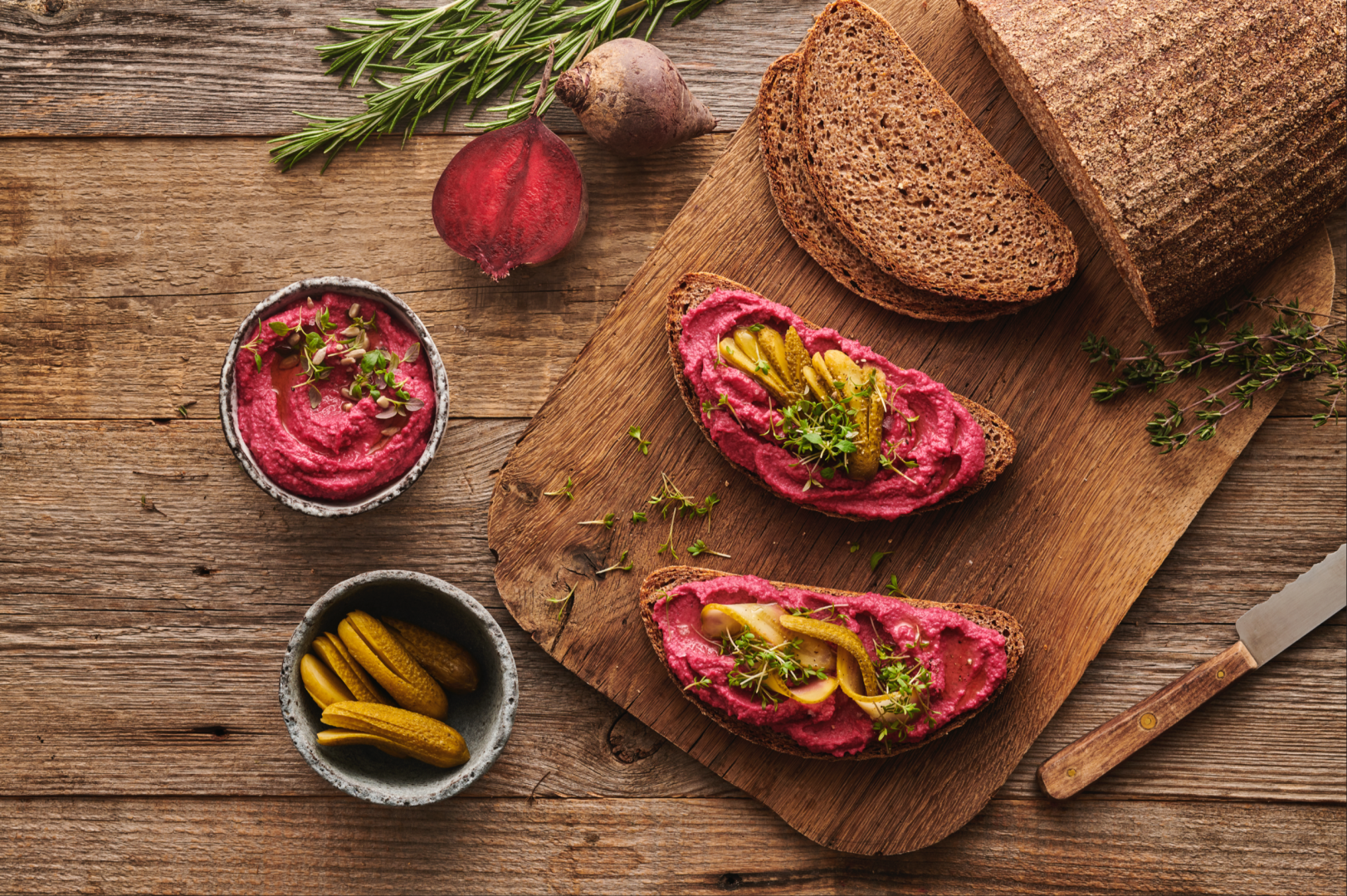 Die Kichererbsen abgießen und abtropfen lassen. Rote-Bete-Knollen in grobe Stücke schneiden. In einer trockenen heißen Pfanne die Sonnen- blumenkerne ohne Öl anrösten. Rosmarin- und Thymian-Zweige waschen. Rosmarin-Nadeln grob hacken und Thymian-Blätter abzupfen. Knoblauch schälen und falls nötig vierteln. Nun alle Zutaten in einen Standmixer ge- ben oder mit einem Stabmixer zu einem cremigen Masse pürieren. Bei Bedarf etwas Wasser zugeben. Bauernbrot in dicke Scheiben schneiden, mit dem Rote-Bete-Hummus bestreichen und mit sauren Gurken garniert servieren.