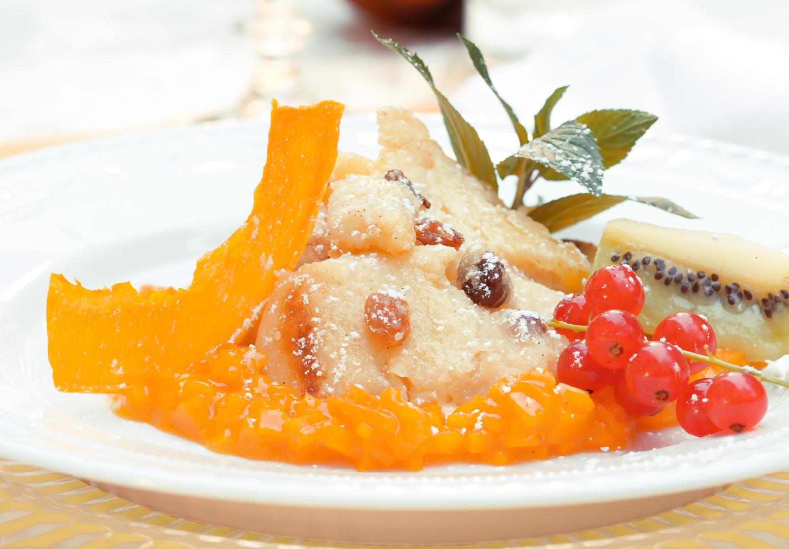 Kürbischip: Vorher vom Kürbis eine hauchdünne Scheibe abschneiden. 50 g Zucker und 50 ml Wasser zum Kochen bringen. Kürbisstreifen durch Zuckerlösung ziehen. Scheibe auf ein Backblech mit Backpapier legen und bei 100 °C 2 bis 3 Stunden im Ofen trocknen lassen. Kaiserschmarren mit Kürbischip, frischen Früchten und Minze dekorieren.