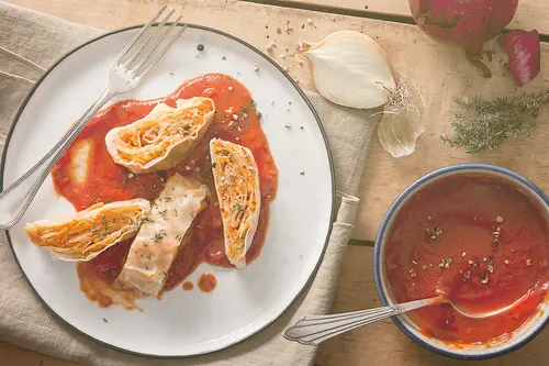 Reichlich frischen Schnittlauch und einen Teelöffel Kümmel darüberstreuen und den Kuchen 30 Minuten backen. Den noch warmen Rahmkuchen in Stücke schneiden und servieren.