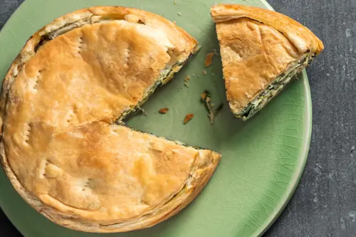 Dinkelmehl zusammen mit dem Schmalz, der Milch und einer Prise Salz zu einem glatten Mürbeteig kneten und 30 Minuten kalt stellen. Ein Backblech einfetten und den Ofen auf 200 °C vorheizen.