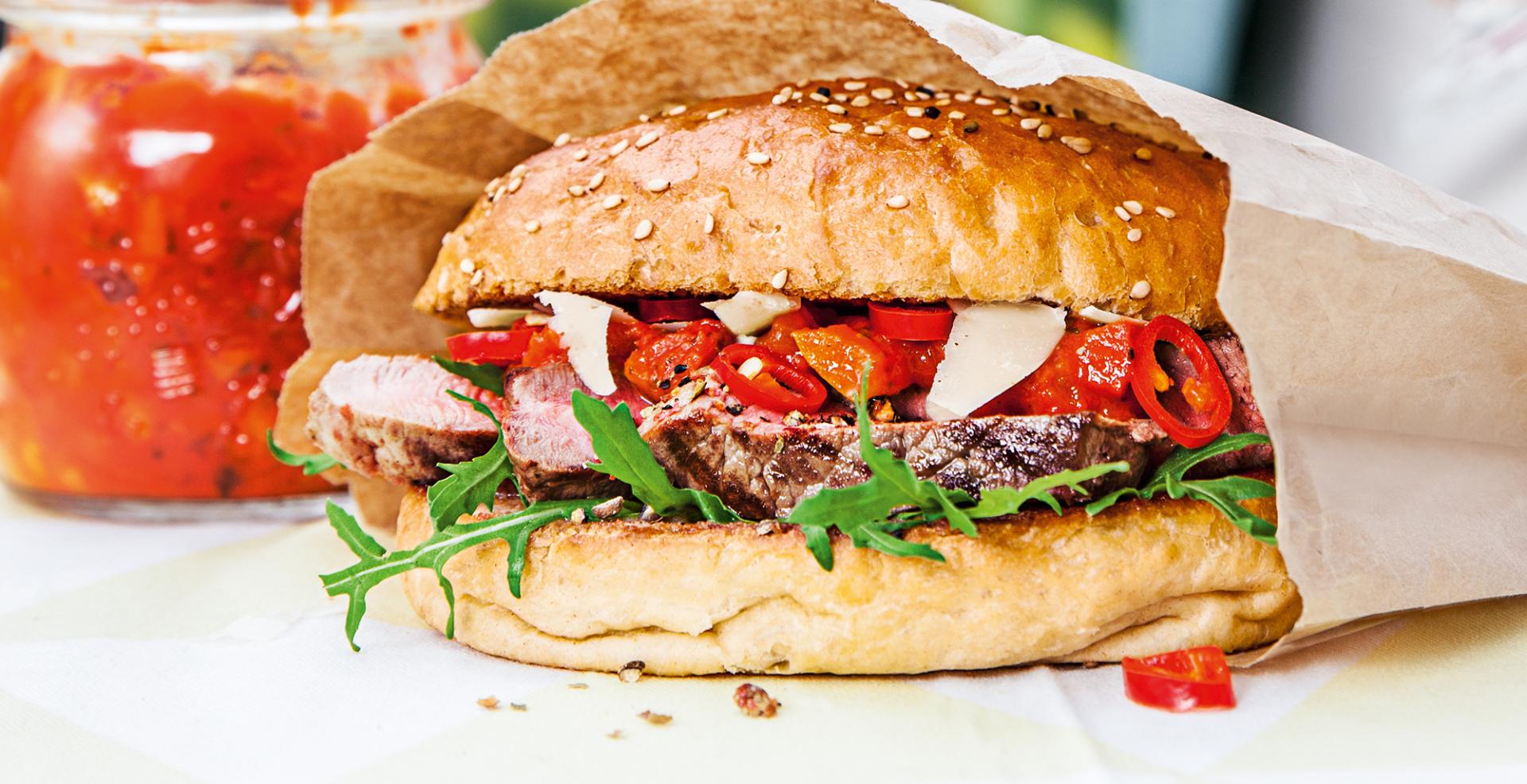 Rinderhüfte in 5 - 7 mm dicke Steak-Flakes schneiden. Peperoni in dünne Scheiben schneiden. Rucola-Salat waschen, trocken schleudern. Pfanne erhitzen, mit wenig Öl benetzen. Steak-Flakes leicht salzen, von jeder Seite kurz scharf anbraten, mit Pfeffer würzen, mit Rum flambieren – aus der Pfanne nehmen (Gar-Vorgang unterbrechen). Im vorgewärmten Ofen bei 70° C für 3 Minuten ruhen lassen. Brötchen gleichmäßig halbieren, Schnittfläche leicht anrösten. Untere Hälfte mit Aioli bestreichen, Rucola-Salat, Steak- Flakes, Tomaten-Paprika-Salsa, Peperoni, frisch geriebenen Grana Padano oder Parmesan und den Deckel aufsetzen.