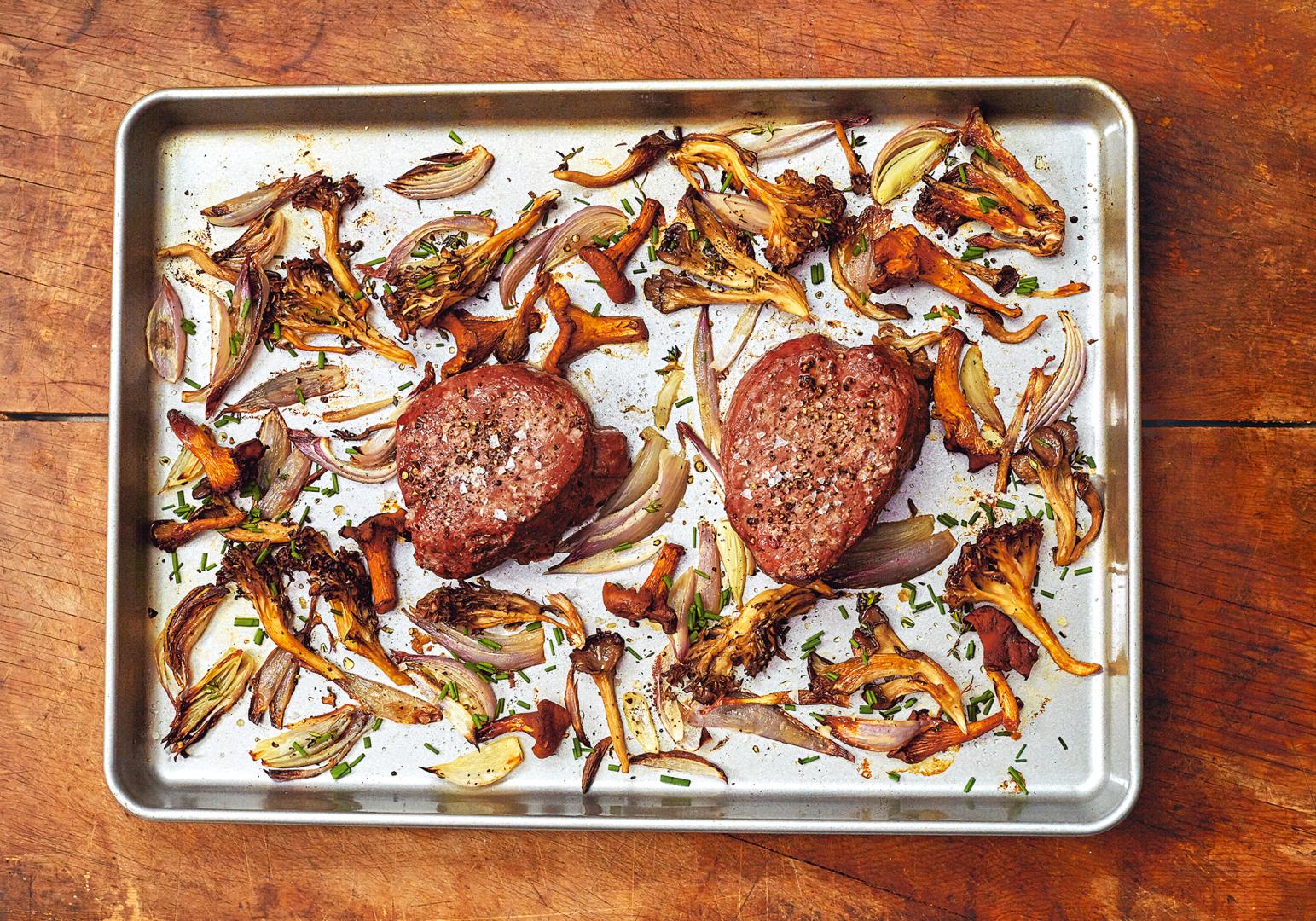 Den Backofen auf 220 °C vorheizen. Die Steaks in die Mitte eines Backblechs legen. Pilze, Brokkoliröschen, Schalotten und Thymian mit Olivenöl vermischen. Um die Steaks herum verteilen. Salzen und pfeffern. Für rosa gebratenes Fleisch 15–20 Minuten im Backofen braten. Die Steaks vor dem Servieren 5 Minuten ruhen lassen. Mit Schnittlauch bestreut servieren.