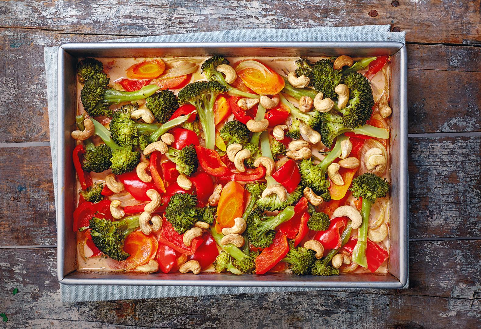 Den Backofen auf 175 °C vorheizen. Kokosmilch, Currypaste, Zwiebel und Karotten in einer großen Auflaufform vermischen. Darüber am besten ein zweites Blech in den Ofen schieben, so dass das Gemüse nicht verbrennt und im Backofen 20 Minuten garen. Brokkoli und Paprikastücke hinzufügen, vermischen und wiederum mit einem zweiten Blech abgedeckt weitere 25–30 Minuten garen, bis das Gemüse weich ist. Salzen und pfeffern. Mit Cashewkernen bestreut servieren.
