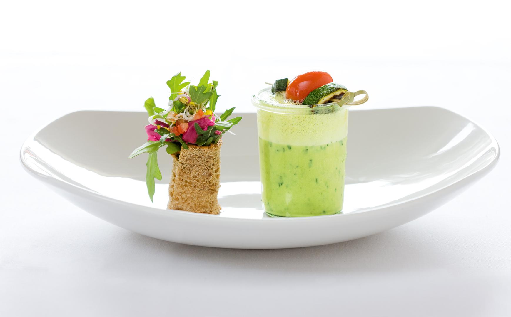 Zucchini in dickere Scheiben schneiden und grillen, Olivenöl mit Kräutern und Knoblauch erhitzen. Zucchini und Cocktailtomaten in Kräuter-Olivenöl langsam erhitzen. Auf einem Spieß garnieren und diesen über die Suppe drapieren.